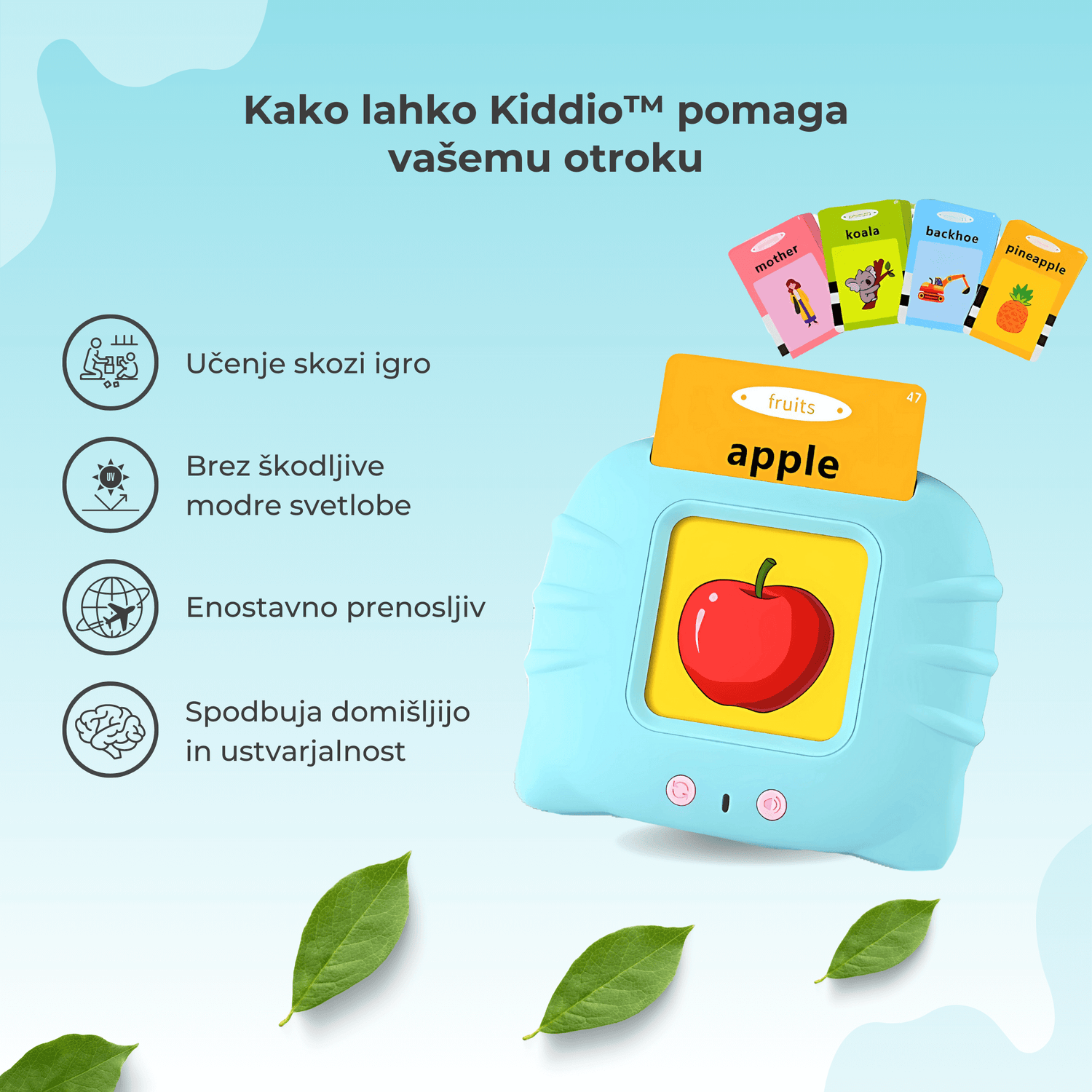 Kiddio spodbuja otrokov govorni razvoj in širi njihov besedni zaklad. Interaktivne kartice s posnemanjem zvokov pomagajo otrokom, da hitro in učinkovito osvojijo nove besede.